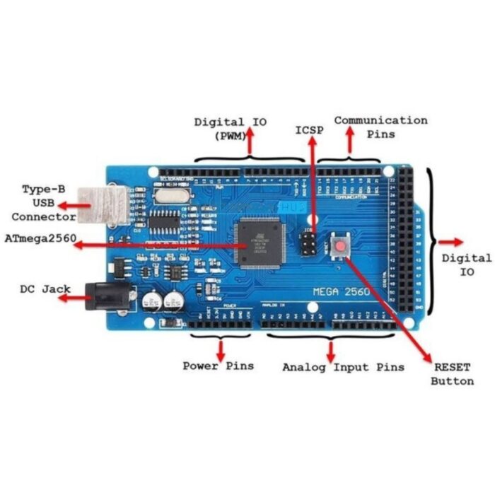 - پینهای PWM: D2 تا D13 و D44 تا D46 (مناسب برای کنترل سرعت موتور، نور LED و…)