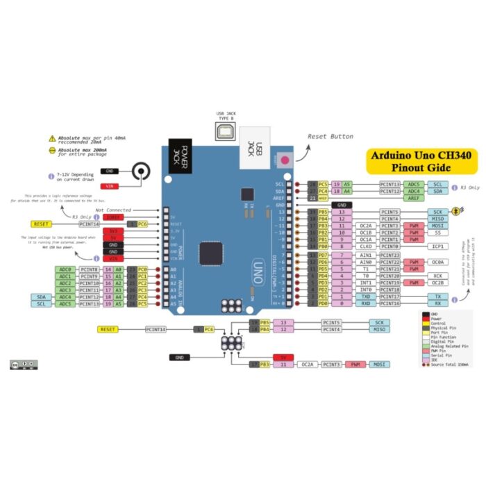 برد Arduino UNO CH340 دارای همان آرایش و ساختار پین‌اوتی است که در نسخه رسمی UNO R3 استفاده شده است. این برد در مجموع 14 پین دیجیتال، 6 پین آنالوگ ورودی، پین‌های تغذیه، و رابط‌های ارتباطی استاندارد مانند UART، SPI و I2C دارد. به دلیل فرم استاندارد UNO، این پین‌ها با تمامی شیلدهای UNO موجود در بازار کاملاً سازگار بوده و برای راه‌اندازی انواع تجهیزات جانبی بدون نیاز به تغییر طراحی مناسب هستند.
