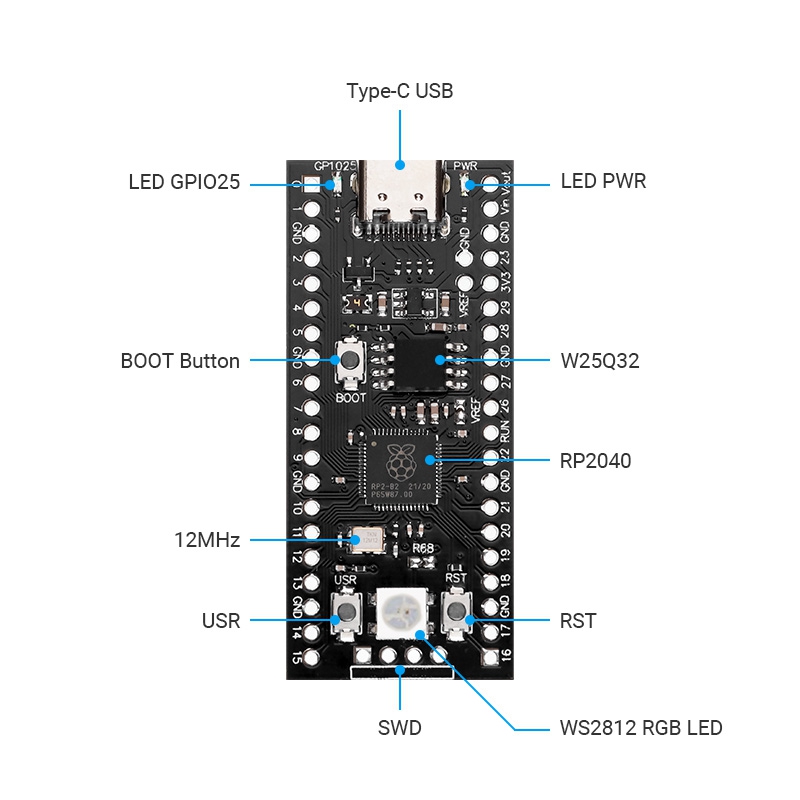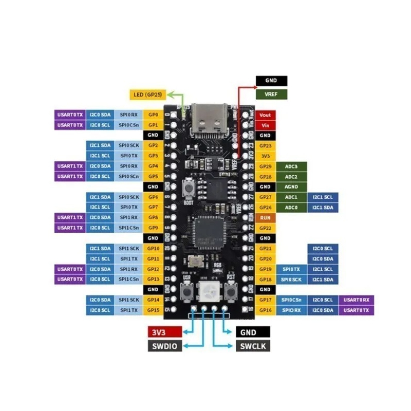 برد توسعه میکروپایتون RP2040، بر پایه تراشه RP2040 و با ساختار استاندارد مشابه Raspberry Pi Pico طراحی شده است. این برد به‌طور ویژه برای اجرای برنامه‌های پایتون و توسعه پروژه‌های الکترونیکی طراحی شده و دارای مزایای قابل توجهی از جمله حافظه بیشتر و LED RGB است. با بهره‌گیری از میکروپروسسور دو هسته‌ای ARM Cortex-M0+ و 264 کیلوبایت RAM، این برد قابلیت پشتیبانی از حداکثر 16 مگابایت فلش خارجی QSPI و تنظیمات ورودی و خروجی منعطفی نظیر I2C، SPI و PIO را دارد. همچنین، این برد به‌دلیل افزایش نشانگر توان PWR، تغییر رابط microUSB به Type-C، و افزودن دکمه‌های ریست و USRkey، تجربه کاربری بهتری را فراهم می‌آورد و به کاربران امکان می‌دهد تا به راحتی به طراحی و ساخت مدارهای پیچیده بپردازند.