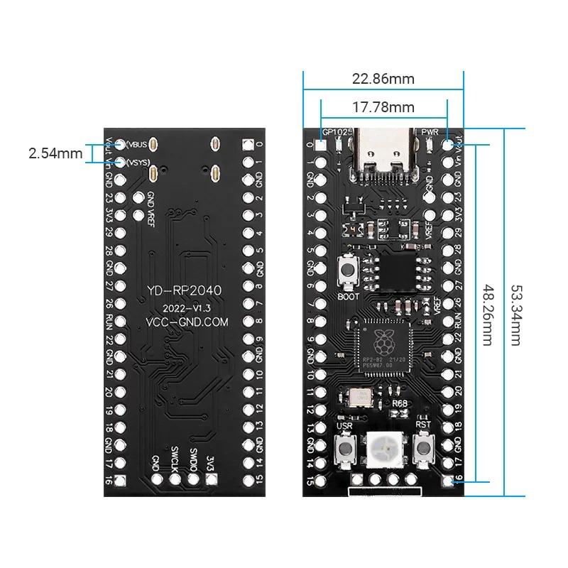 ●Change the microUSB interface of Raspberry Pi Pico to Type-C of YD-RP2040 core board, the USB interface is convenient for users to find related USB cables more conveniently.