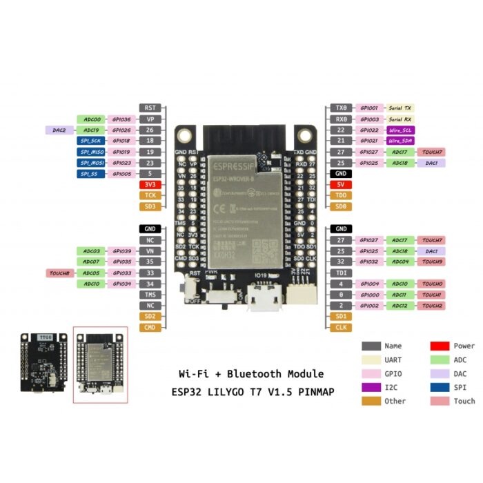 برد توسعه T7 Mini32 V1.5 با هسته ESP32-WROVER-E دارای بلوتوث و وایفای داخلی