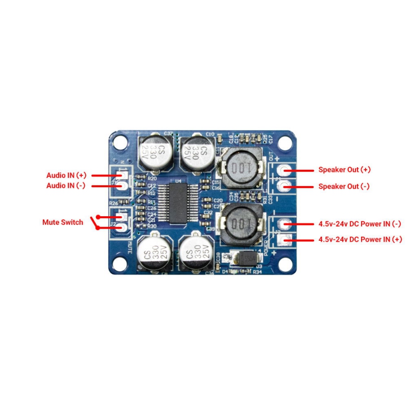 This board can run one 4 ohms speaker or one 8ohms, which 8ohms speaker is the best selection to achieve continuous 60W output power. This module can be supplied with a wide range of 8V up to 26V that 24V with 2.5A is recommended. This amplifier board has 8 solder pad, 2 for supplying wires, 2 for connecting the speaker and 2 for feeding audio inputs, and 2 for jumpering to mute the output sound.