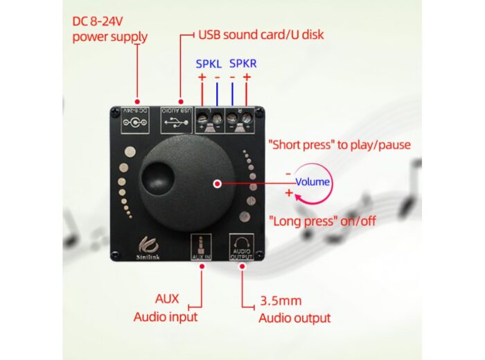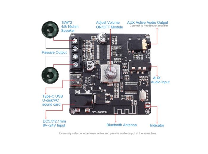 XY-AP15H یک ماژول تقویتکننده صوتی استریو بلوتوث با توان بالا است. این ماژول دارای خروجی صوتی دو کاناله بوده و به دلیل وجود تقویتکننده داخلی، میتواند مستقیماً به بلندگو متصل شود. این ماژول گزینهای ایدهآل برای ساخت اسپیکرهای بلوتوثی DIY و سیستمهای صوتی بیسیم محسوب میشود.این ماژول با اپلیکیشن Sinilink سازگار است که امکان نمایش منبع صدای جاری و تغییر تنظیمات اکولایزر را فراهم میکند. برای جلوگیری از تداخل با سیگنال Wi-Fi (روتر)، بهتر است ماژول را در فاصلهای دور از روتر قرار دهید.