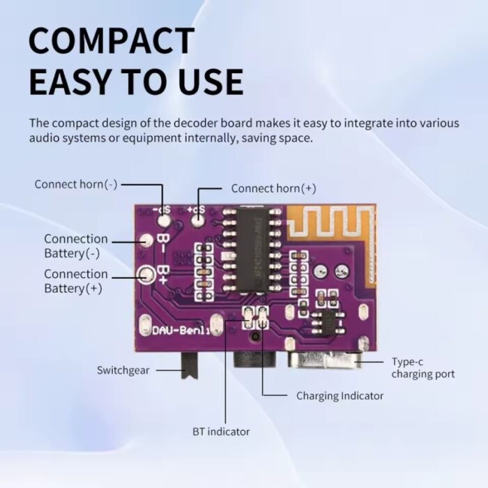 ماژول ارائهشده یک برد تقویتکننده صوتی (آمپلیفایر) مونو با قابلیت بلوتوث و شارژ باتری از طریق پورت Type-C است. این ماژول با طراحی ساده، برای پروژههای صوتی قابلحمل و اسپیکرهای کوچک بسیار مناسب است.