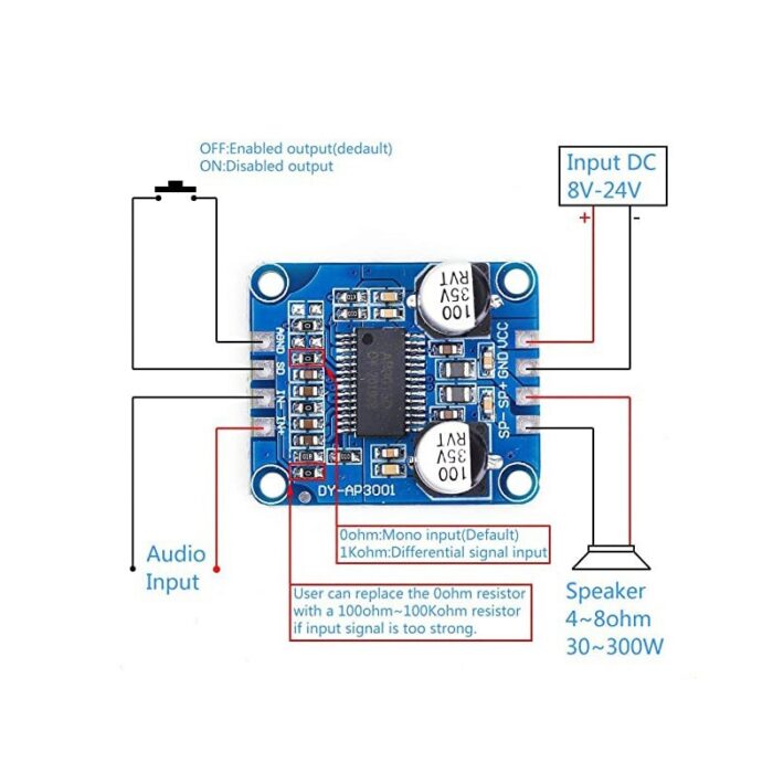 High-power single-channel (30W) Class D digital amplifier module using AP3016D amplifier chip. This module has low noise, mute function, wide operating voltage, and can connect to 300W speakers.
