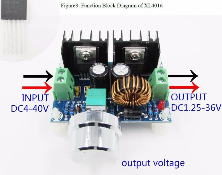 This product uses XL4016 switch regulator chip, with MBR10200 dual rectifier, the input up to 40V, the output 1.25-36V continuously adjustable