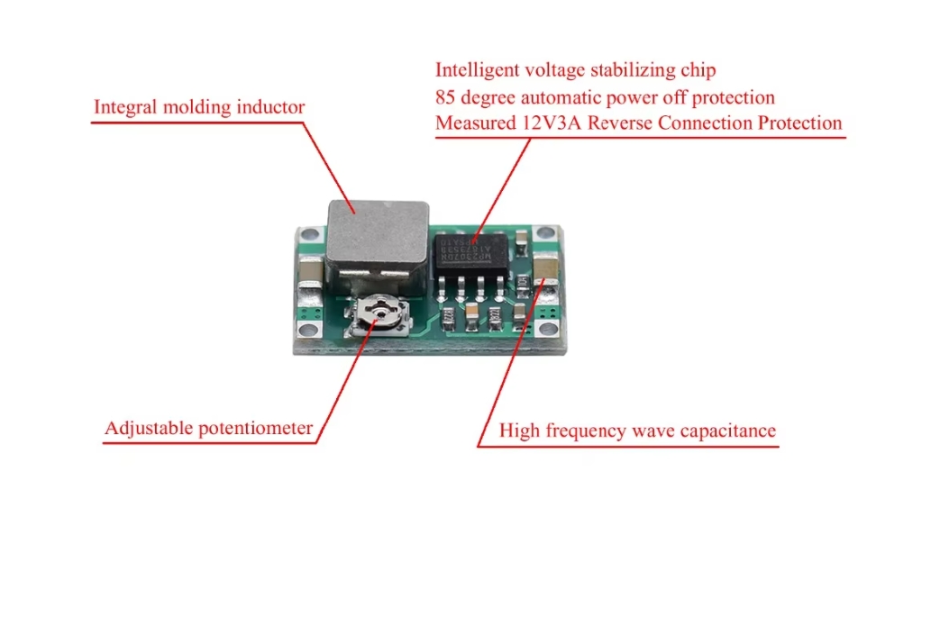 ماژول رگولاتور DC به DC متغیر کاهنده MINI-360 یک ماژول کوچک و کارآمد برای کاهش ولتاژ ورودی DC بین 4.75 تا 23 ولت به ولتاژ خروجی قابل تنظیم بین 1 تا 17 ولت است. این ماژول با یکسو‌سازی هم‌زمان و بهره‌وری تا 96%، قادر به ارائه جریان حداکثر 3 آمپر (1.8 آمپر در استفاده طولانی‌مدت) است. با فرکانس سوییچینگ 340 کیلوهرتز و ابعاد کوچک، این ماژول مناسب برای کاربردهای مختلفی از جمله منبع تغذیه موبایل DIY، خودرو و تجهیزات ارتباطی است که نیاز به محدودیت‌های حجم و وزن دارند.