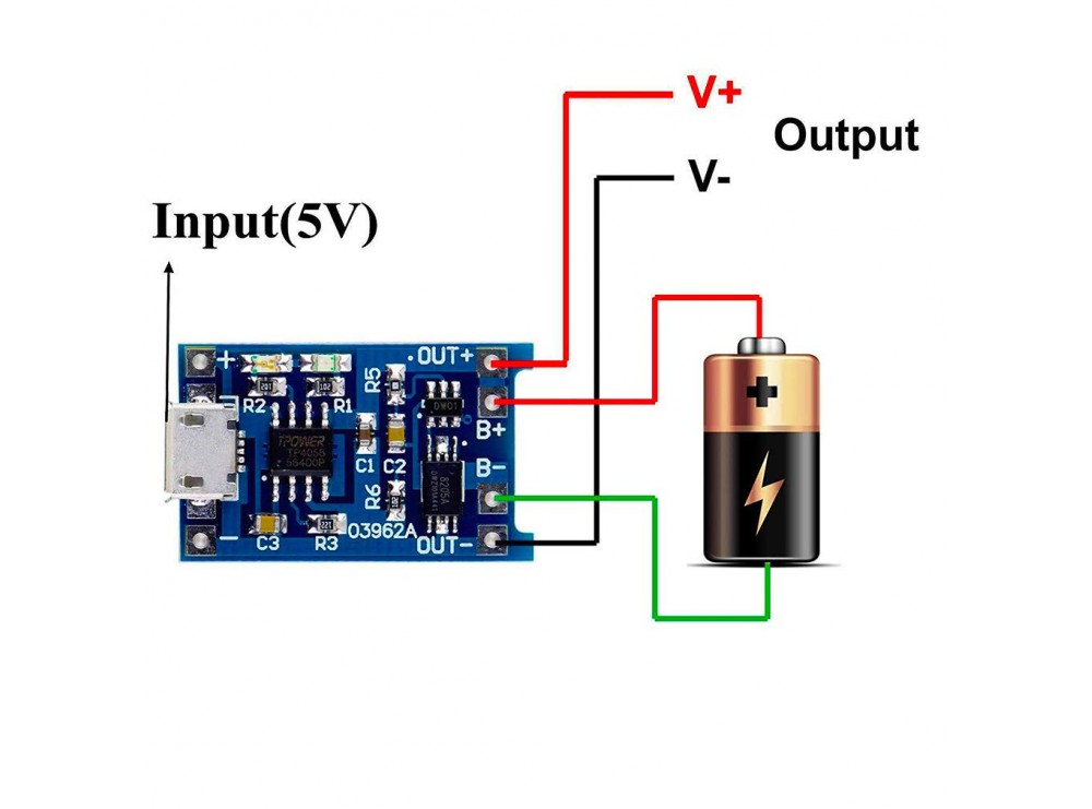 با این ماژول می توانید به راحتی باتری های لیتیومی را شارژ کنید. همانطور که در تصویر می بینید ماژول تغذیه ی 5 ولتی خود را از طریق سوکت USB تامین می کند و همچنین می توانید از پین های کناری سوکت جهت اعمال ولتاژ استفاده کنید. شارژر دارای دو نشانگر LED جهت نمایش وضعیت باتری و محافظ شارژ و دشارژ است.