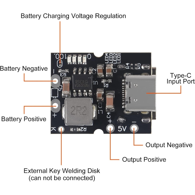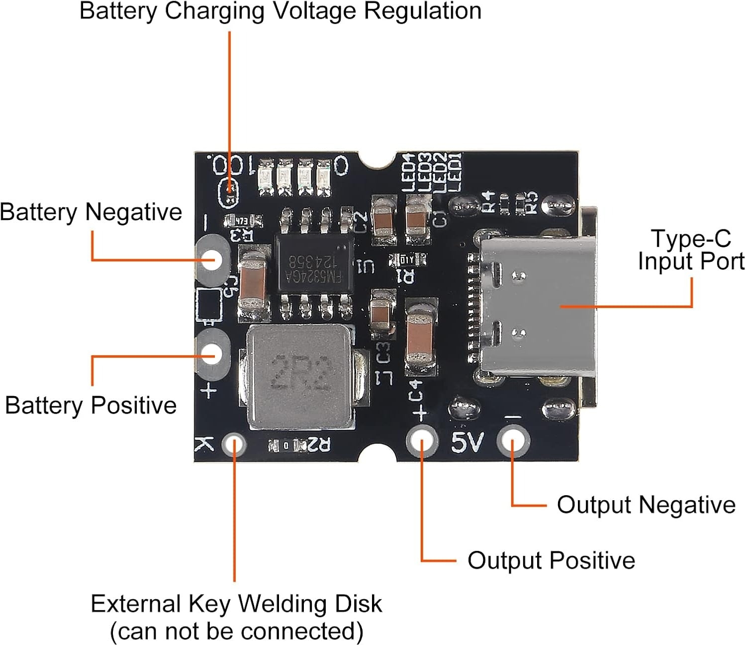 این ماژول برای شارژ و دشارژ باتریهای لیتیوم یونی تکسل است که با داشتن ورودی Type-C امکان شارژ آسان با شارژرهای رایج موبایل را فراهم میکند. مدار داخلی ماژول علاوه بر کنترل دقیق فرآیند شارژ (با ولتاژ 4.2V یا 4.35V قابل پیکربندی)، شامل یک مبدل افزاینده (Boost Converter) با راندمان بالا است که ولتاژ باتری را به مقدار ثابت 5V تقویت میکند. این ویژگی ماژول را برای ساخت پاوربانک، منبع تغذیه پرتابل یا تغذیه مستقیم مدارات 5V بسیار مناسب میسازد. جریان خروجی تا 2A باعث میشود بتوان دستگاههای مختلف مانند گوشی هوشمند، بردهای آردوینو، ماژولهای IoT و تجهیزات قابل حمل را با آن راهاندازی کرد. طراحی فشرده، وجود LEDهای وضعیت شارژ/دشارژ و مدار محافظ ولتاژ و جریان از دیگر مزایای این ماژول هستند.
