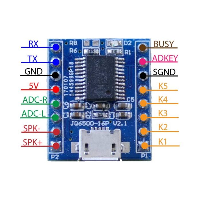 ماژول JQ6500 یک سیستم پخش صوتی دیجیتال است که برای اجرای فایلهای MP3 ذخیرهشده در حافظه داخلی طراحی شده است. این ماژول دارای رابط micro USB برای انتقال مستقیم فایلها و تغذیه بوده و از طریق پورت UART یا کلیدهای دیجیتال (K1 تا K5) قابل کنترل است. همچنین قابلیت کنترل از طریق مقاومتهای متغیر از طریق پورت ADKEY را داراست. از دیگر امکانات فنی میتوان به خروجی صوتی DAC با دقت 24 بیت، خروجی مستقیم به بلندگو با توان 3 وات و امکان تنظیم صدا در 30 سطح اشاره کرد. این ماژول از نرخهای نمونهبرداری استاندارد تا 48kHz پشتیبانی میکند و مناسب پروژههایی است که نیاز به اجرای فایلهای صوتی بهصورت مستقل یا با کنترل از طریق میکروکنترلر دارند. راهاندازی آسان، ابعاد کوچک و امکانات تنظیم EQ در 10 سطح از مزیتهای مهم آن بهشمار میروند.