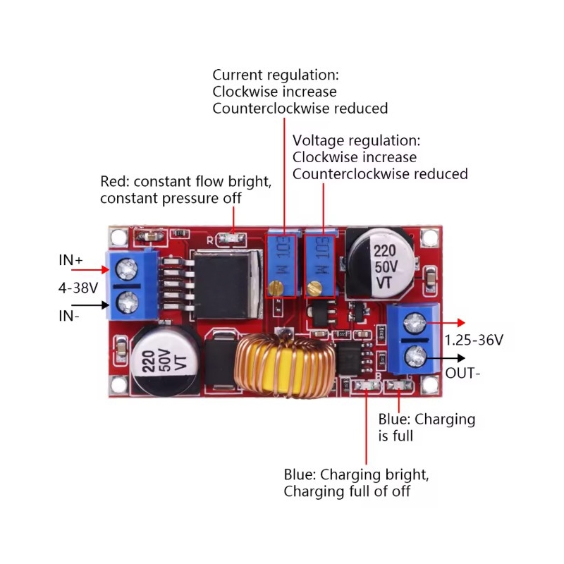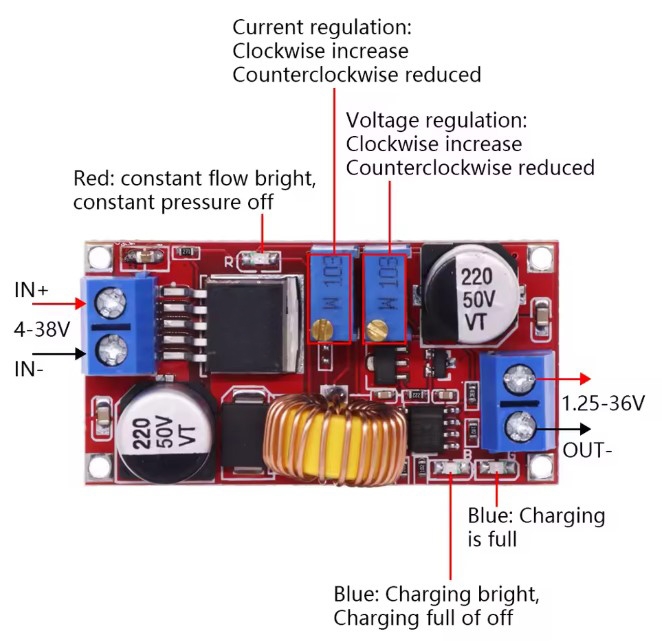 Under no-load conditions, adjust the “Voltage potentiometer” so that the output voltage reaches the float voltage; (if to 3.7V rechargeable lithium battery, the output voltage can be adjusted to 4.2V)