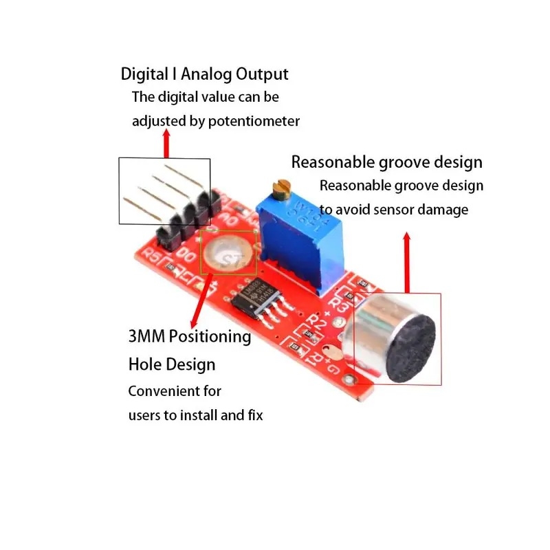 این ماژول مجهز به یک میکروفن خازنی و تقویتکننده عملیاتی (Op-Amp) داخلی است که امکان دریافت و پردازش صداهای محیطی را فراهم میکند. خروجی دیجیتال این ماژول بر اساس سطح حساسیتی که توسط مولتیترن (پتانسیومتر چند دور) تنظیم میکنید، فعال یا غیرفعال میشود. بدین ترتیب میتوان آن را بهعنوان یک سنسور تشخیص صدا یا تشخیص ضربه مورد استفاده قرار داد. علاوه بر خروجی دیجیتال، یک خروجی آنالوگ نیز در نظر گرفته شده که شدت سیگنال صوتی دریافتشده را بهصورت ولتاژ متغیر ارائه میدهد. این ویژگی موجب میشود تا بتوان از ماژول هم در کاربردهای ساده تشخیص صدا و هم در پروژههای پردازش سیگنال صوتی استفاده کرد. ماژول با تغذیه 5 ولت کار میکند و بهسادگی با انواع بردهای میکروکنترلر از جمله Arduino، STM32 و ESP سازگار است.