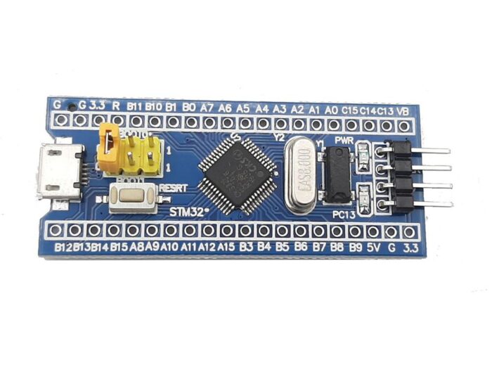 خانواده STM32 از سری میکروکنترلرهای 32 بیتی مبتنی بر پردازنده ARM Cortex می باشد که با هدف ایجاد معنای جدیدی از آزادی عملکرد برای کاربران میکروکنترلرها ایجاد گشته است. در این خانواده از میکروکنترلرها تلفیقی از کارایی بالا، عملکرد همزمان، پردازش سیگنال های دیجیتال و کاربردهای کم توان در بالاترین سطح کیفی و با حفظ یکپارچگی کامل و سهولت توسعه، ارائه می گردد.از جمله امکانات مهم میکرکنترلر STM32F103C8T6 ، هسته Cortex M3 با سرعت 72MHZ، اینترفیس موازی ، ADC 12 بیتی و دارا بودن اینترفیس های متنوعی از جمله USB، Can، I2C، USART، SDIO و … می باشد.