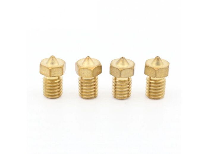 The E3D v6 Copper Nozzles are manufactured from a high-temperature copper-alloy that will not soften until above 500C, this makes them perfectly suited for extremely high-temperature applications. With very high thermal conductivity, these v6 copper nozzles make for faster heat-up times and will perform well with most filaments on the market.
